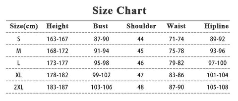 Size: Asian Size, the size chart may have a 1-3 cm error due to the measuring method.