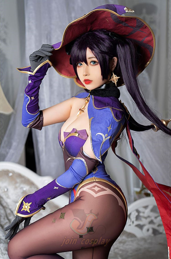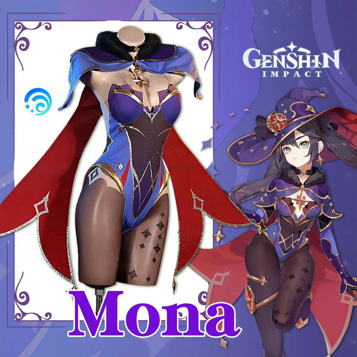 Series: Genshin Impact Characters: Mona Megistus Catagory: Cosplay Costume Material: Polyester fiber Package Include: ・Transparent Straps ・Back waist decorative chain